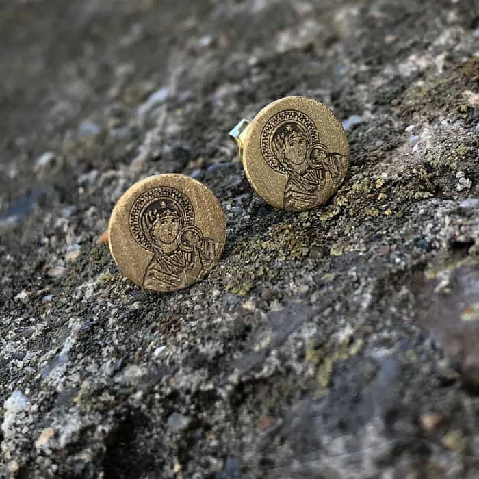 Cercei efect sclipici cu Maica Domnului , bănuț 10 mm, 1,27gr